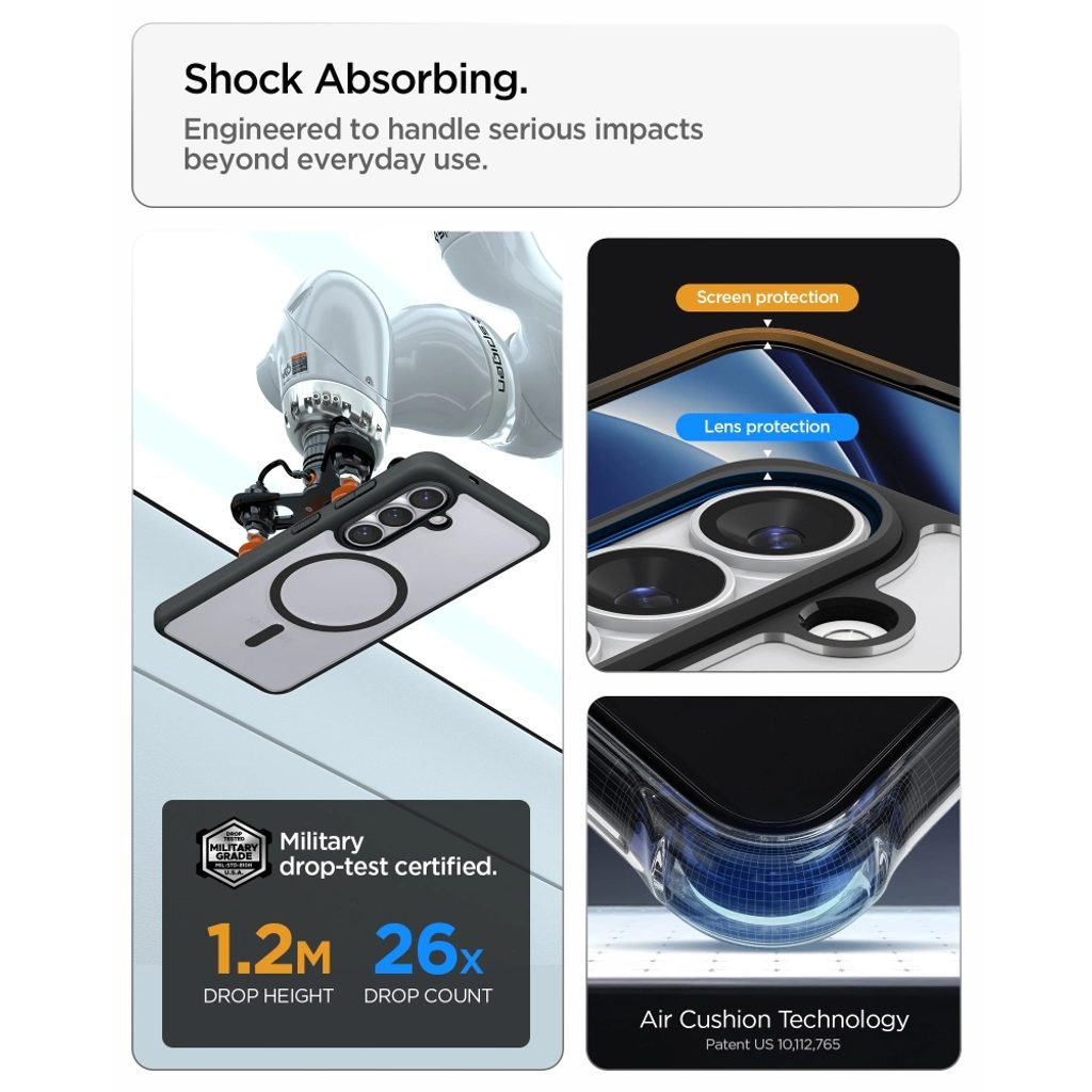 Husa Ultra Hybrid de la Spigen, care combină designul minimalist cu protecția de top. Este fabricată din plastic TPU durabil și flexibil, care înconjoară în siguranță întregul dispozitiv pentru a oferi o amortizare excelentă. În plus, este completată cu un panel rigid din policarbonat care protejează împotriva zgârieturilor și consolidează construcția. Produsul se potrivește perfect, este complet funcțional, nu restricționează accesul la porturile externe și protejează eficient telefonul la căderi. Ultra Hybrid este soluția ideală de protecție menținând greutatea și grosimea minimă.